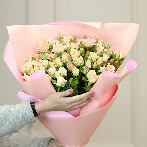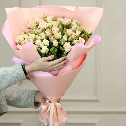 Миниатюрные светлые бутоны кустовой розы обладают скромным очарованием, свежестью и трепетной красотой. Самый нежный и романтичный способ рассказать о своих чувствах, порадовать близкого человека, окружить его вниманием и заботой.